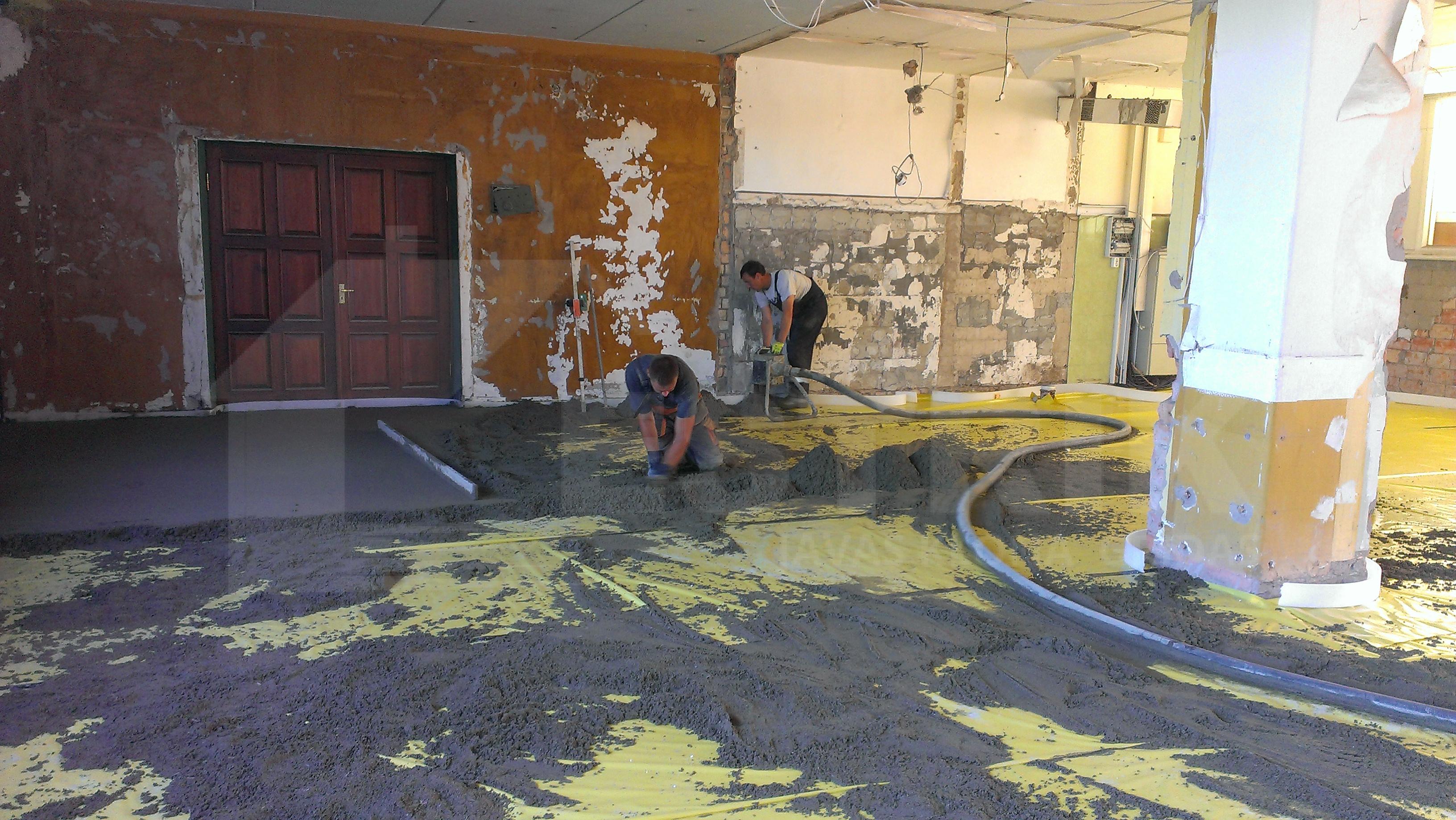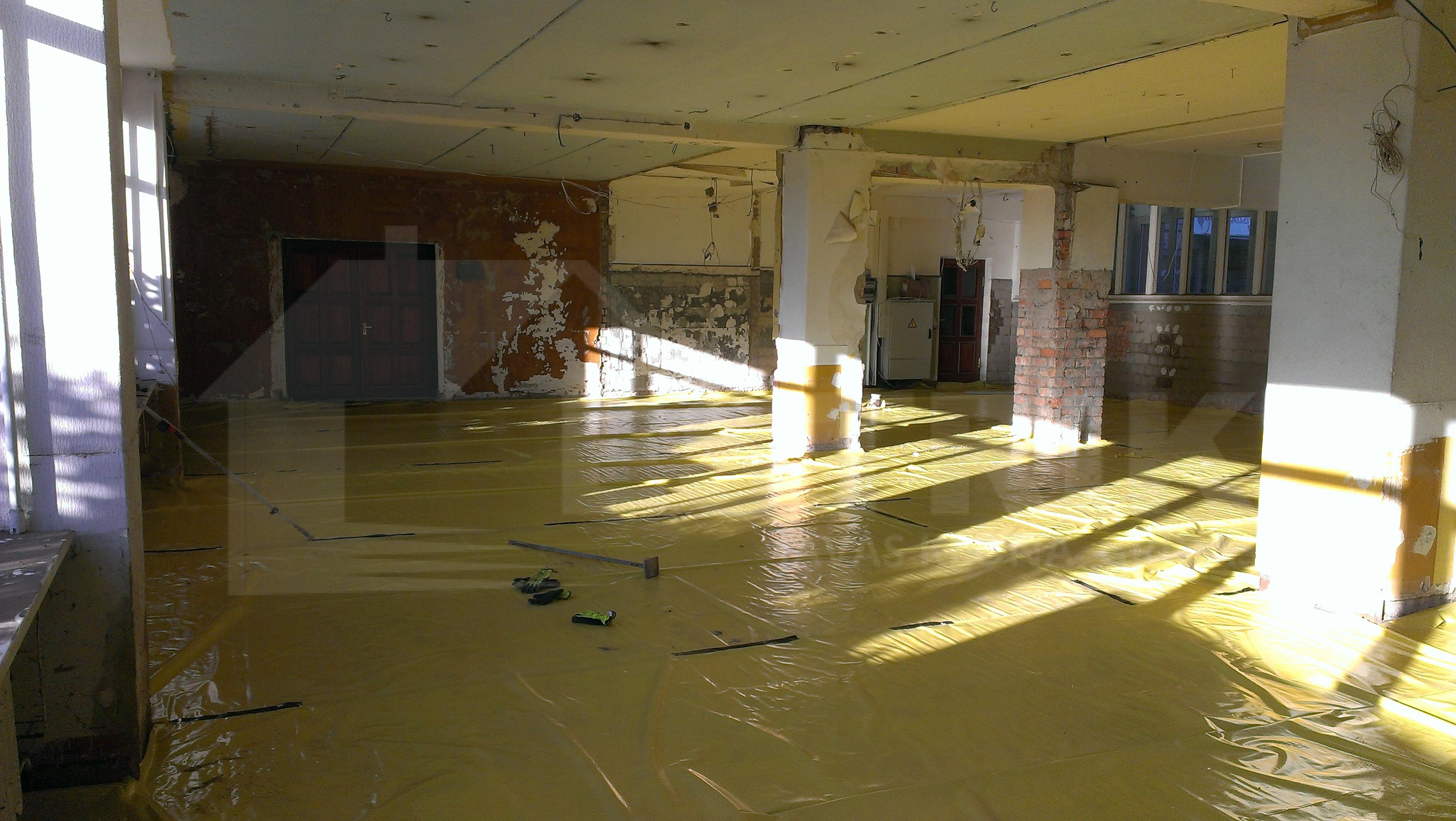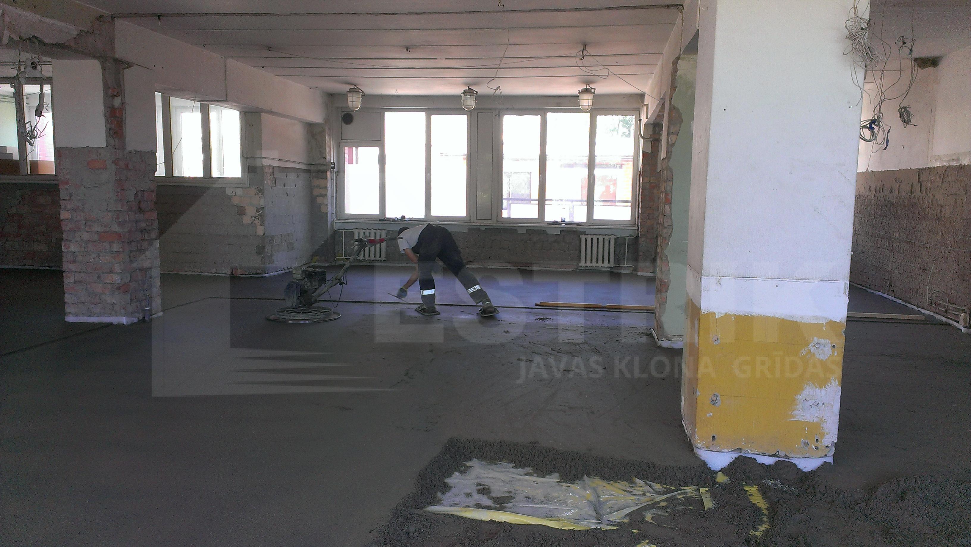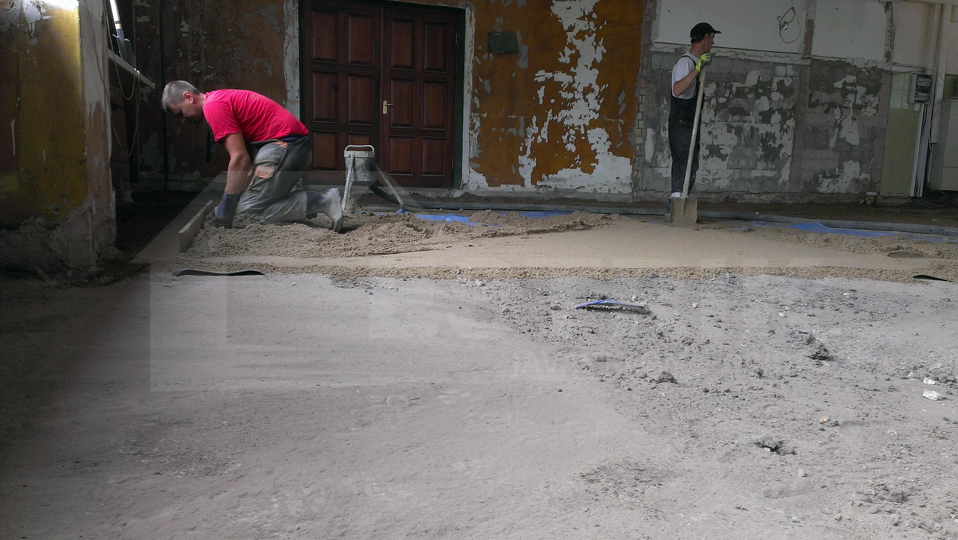 Pamatnes izlīdzināšana ar smiltīm, siltumizolācijas materiāla (putupolistirola plākšņu) ieklāšana, tvaika izolācijas slāņa PE plēves ieklāšana, grīdu betonēšana – armēta javas klona grīda (estrich grīda) – kultūras nama telpām.