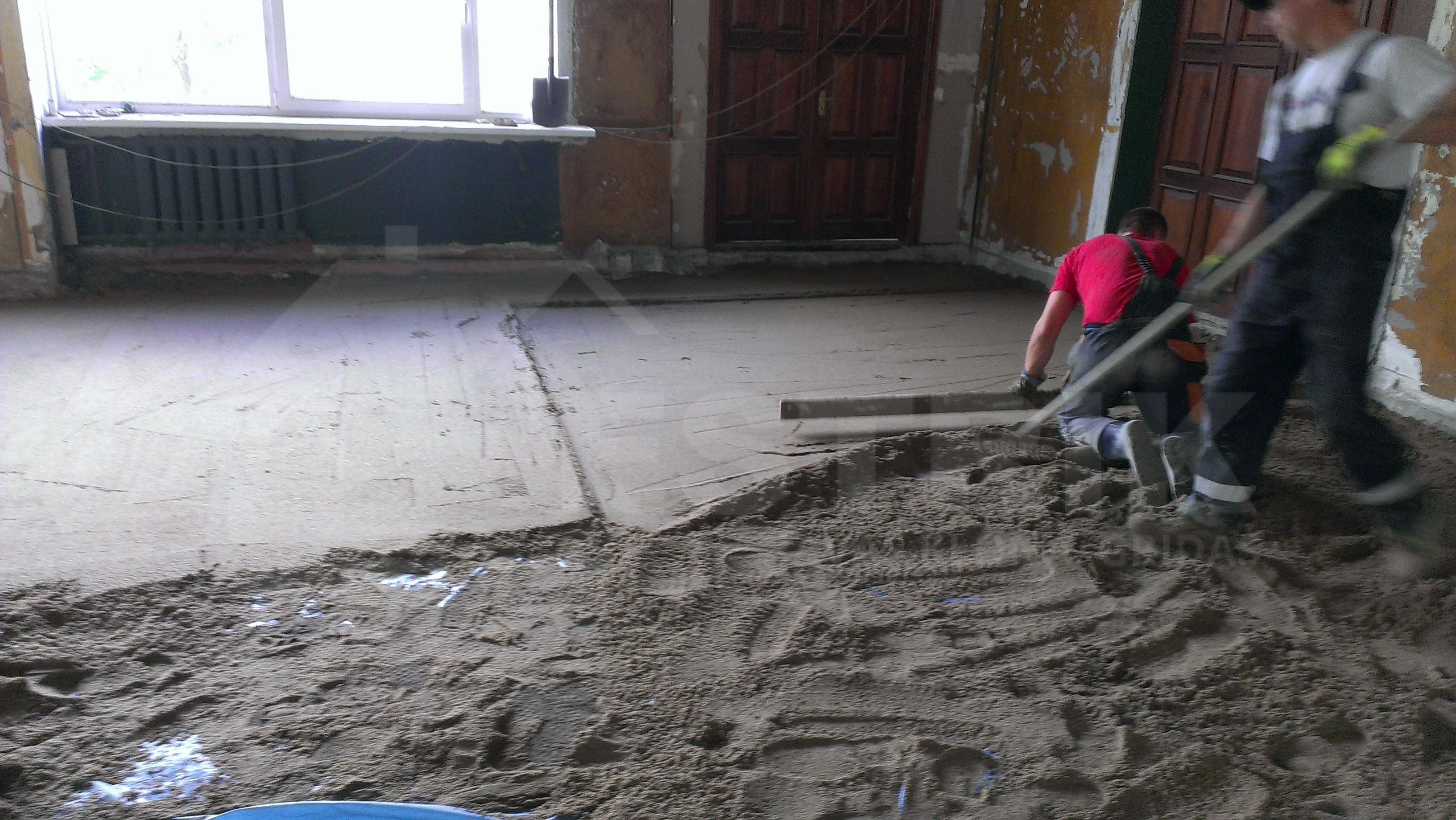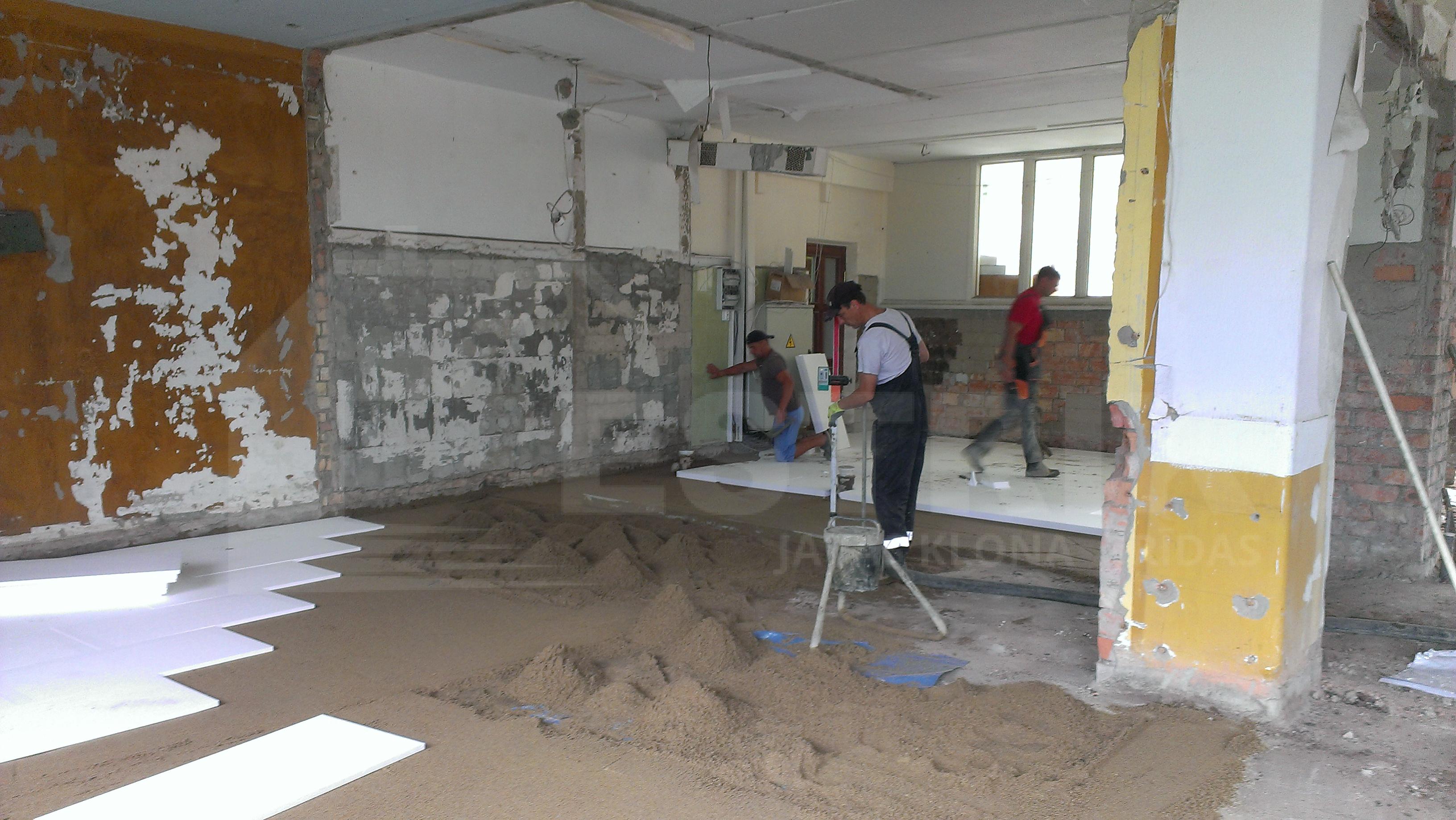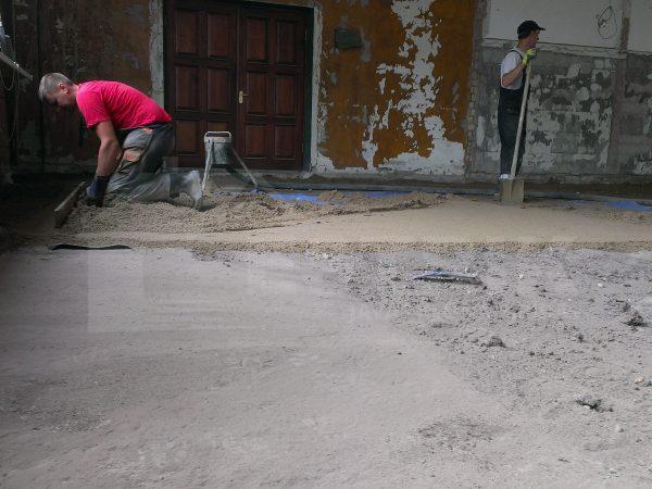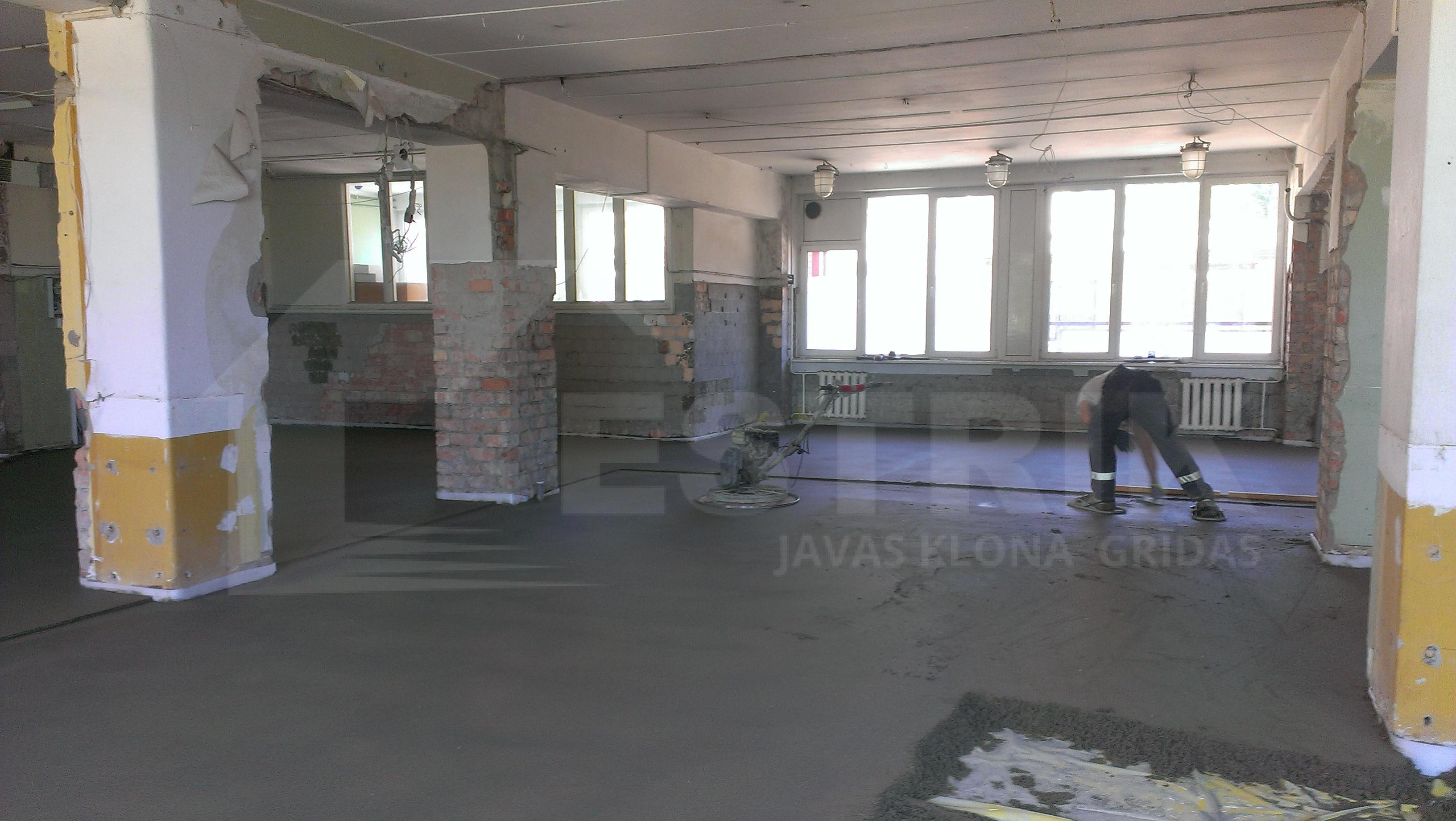 Pamatnes izlīdzināšana ar smiltīm, siltumizolācijas materiāla (putupolistirola plākšņu) ieklāšana, tvaika izolācijas slāņa PE plēves ieklāšana, grīdu betonēšana – armēta javas klona grīda (estrich grīda) – kultūras nama telpām.
