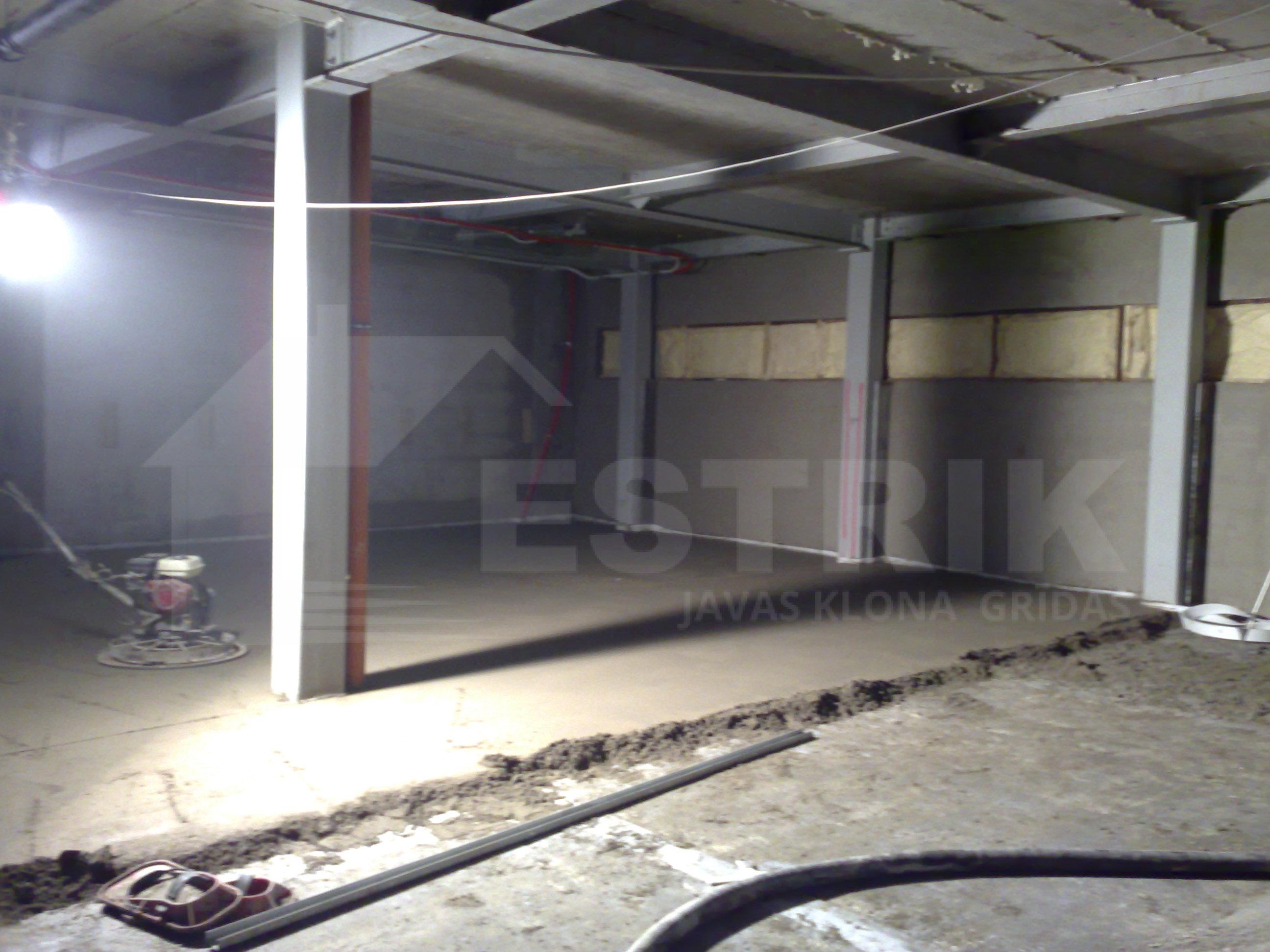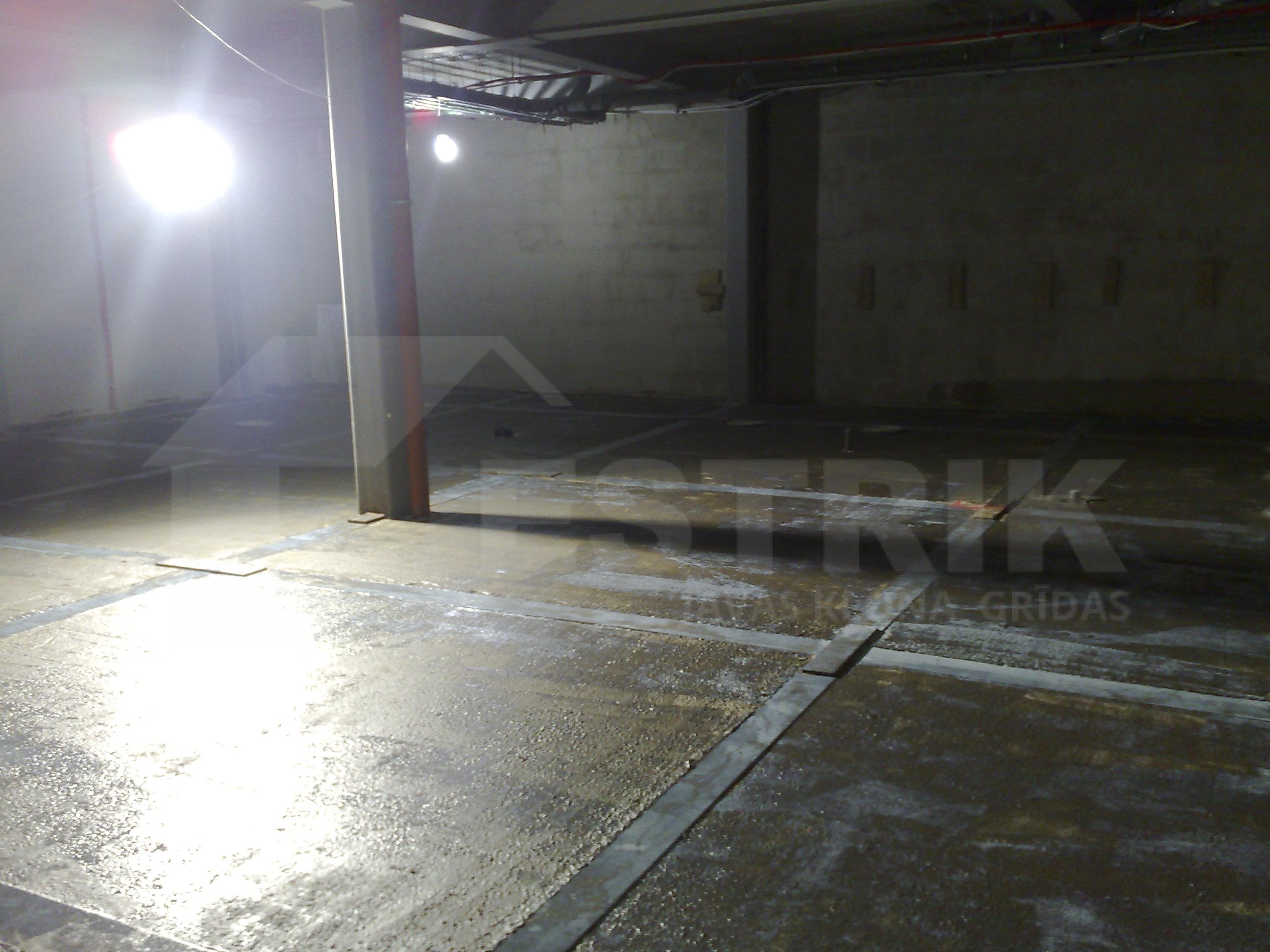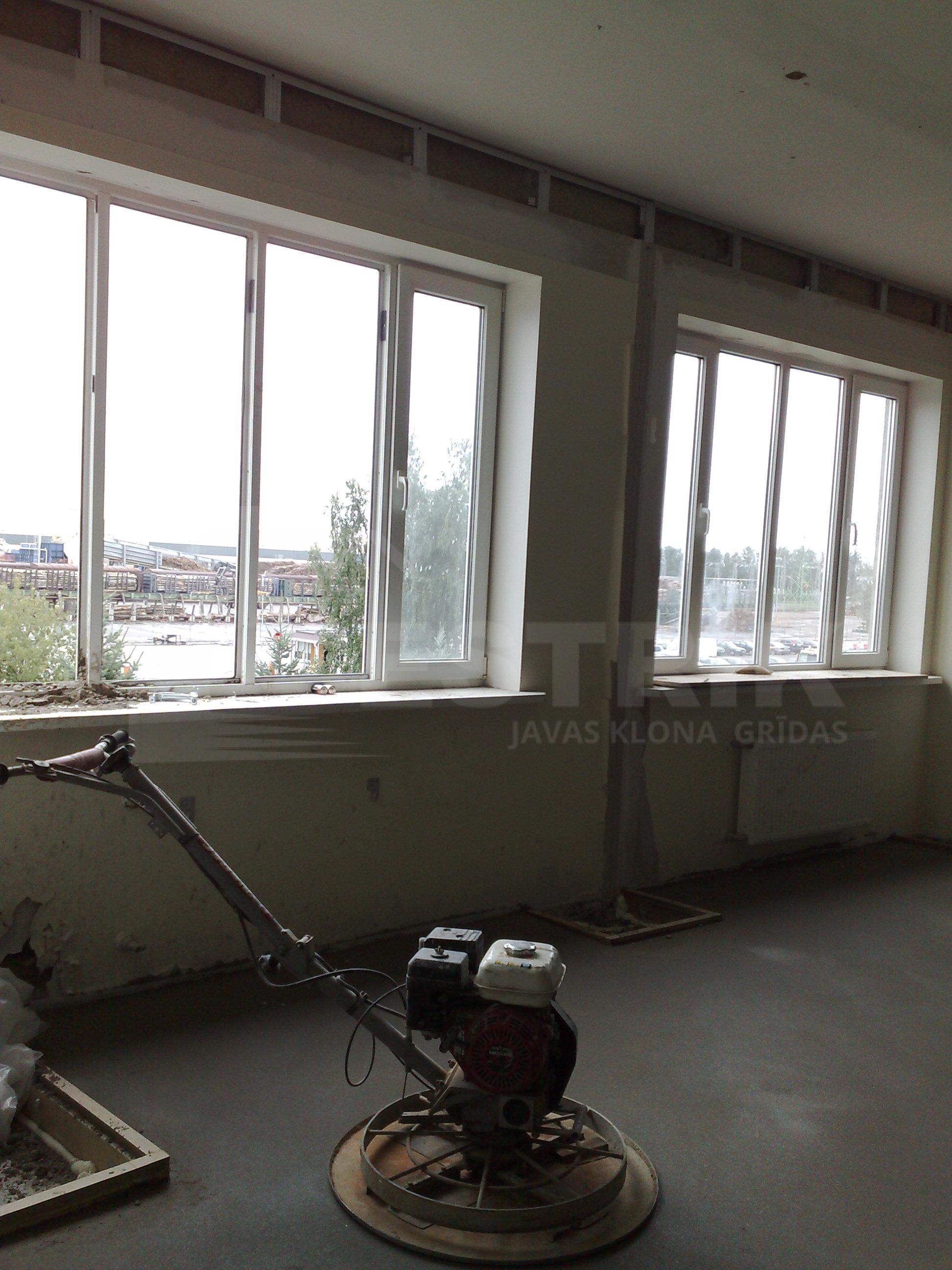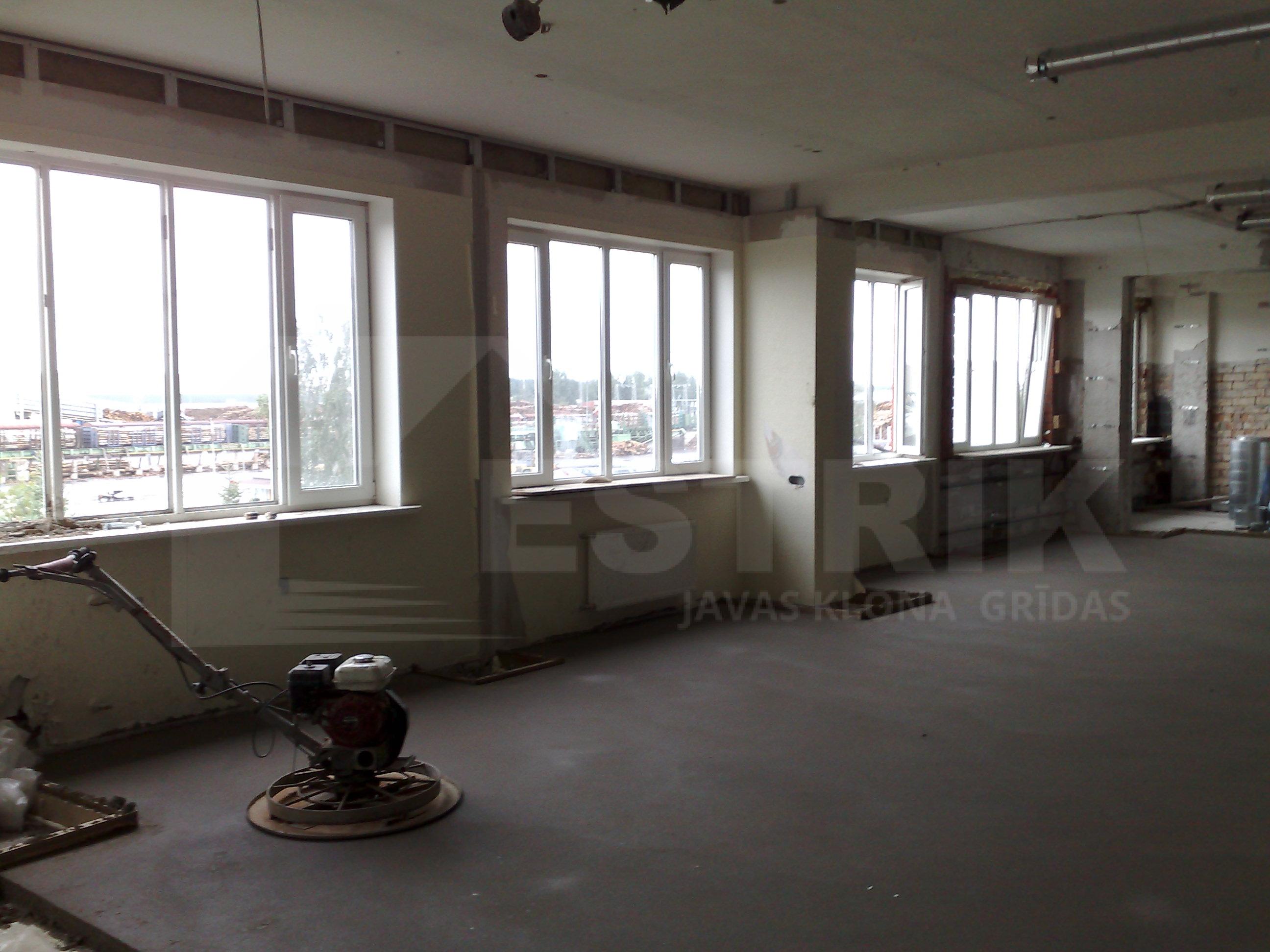 Izlīdzinošais cementa javas slānis (estrich grīda) uz betona pārseguma ofisa telpām.