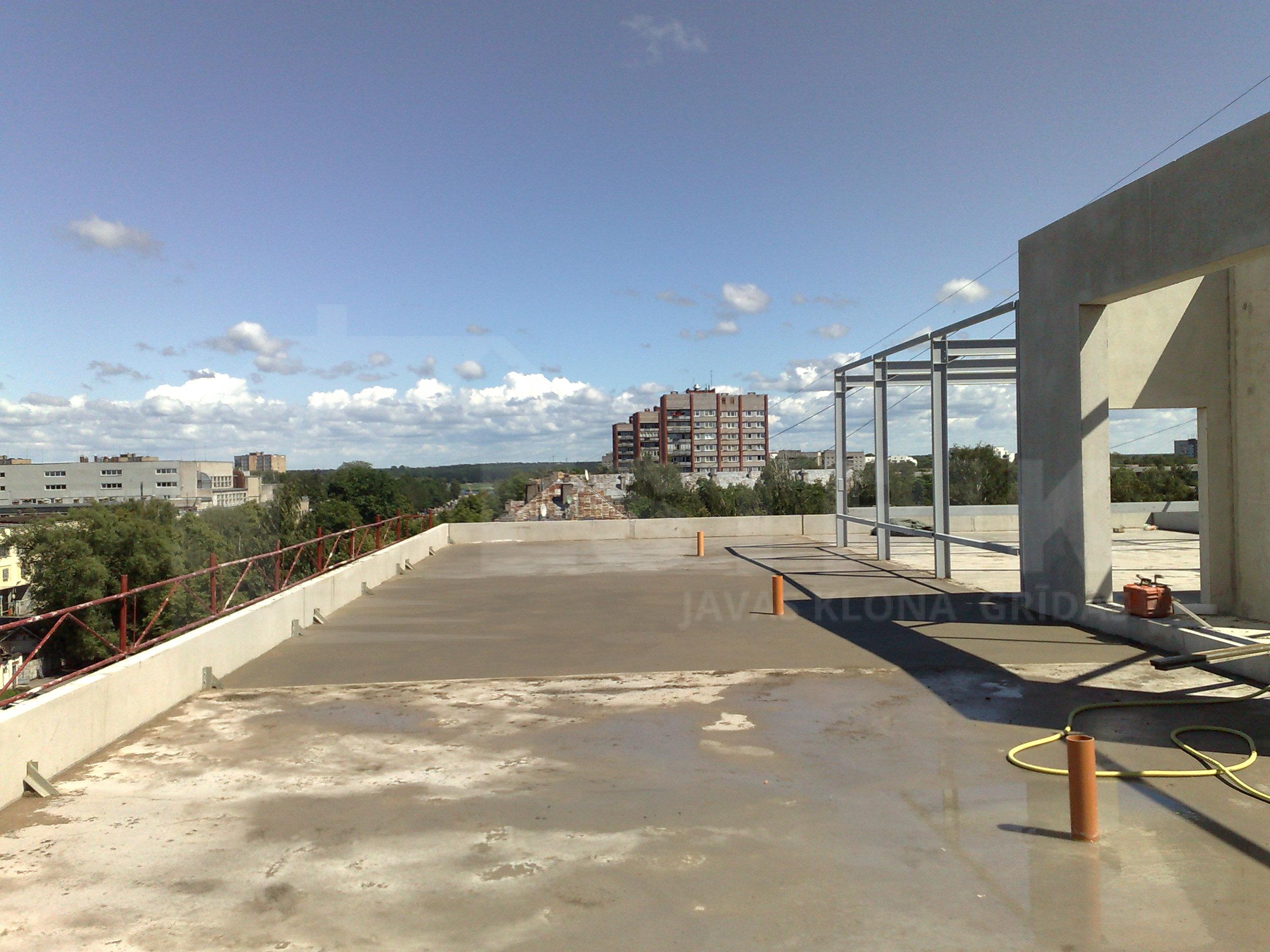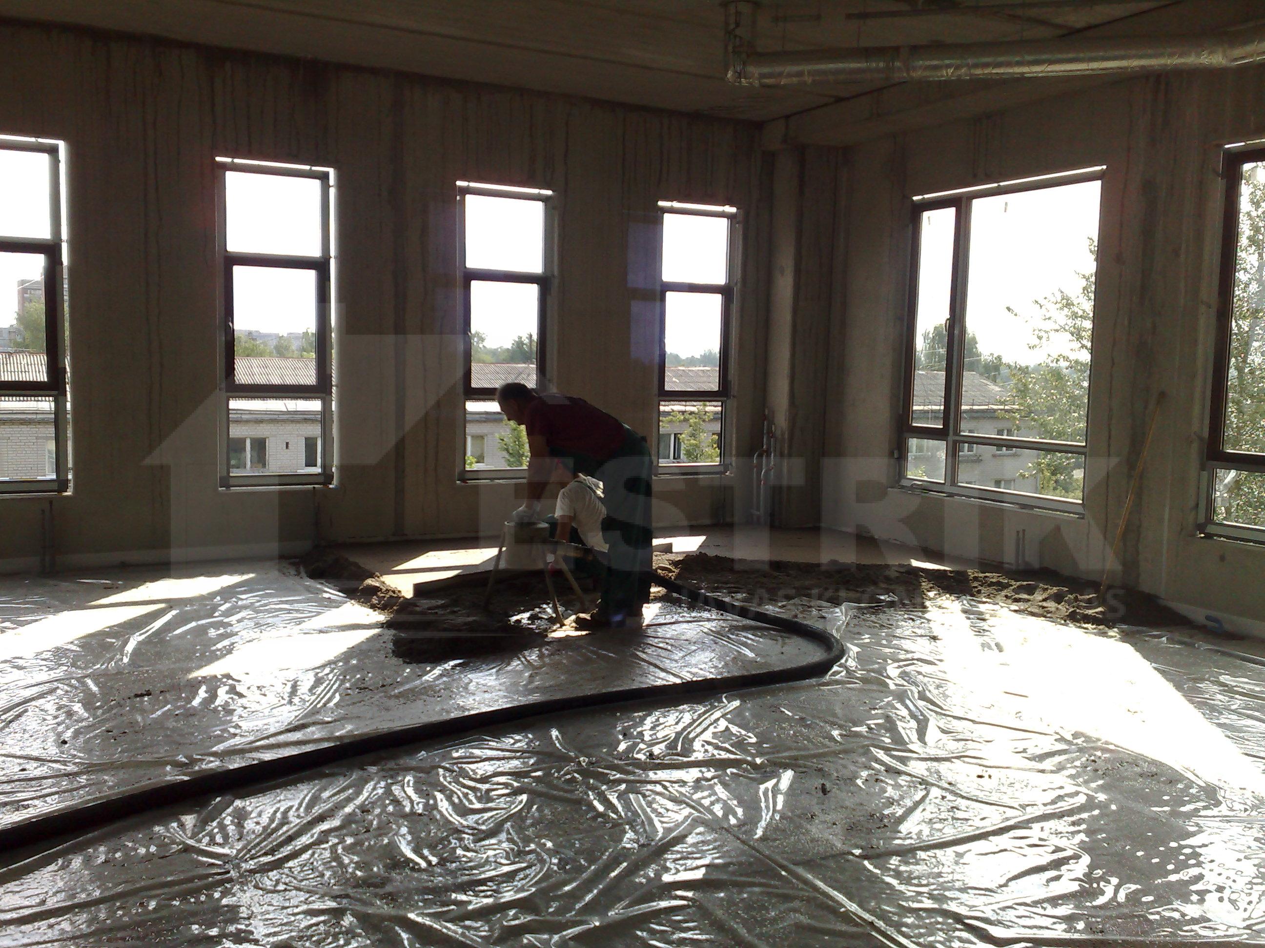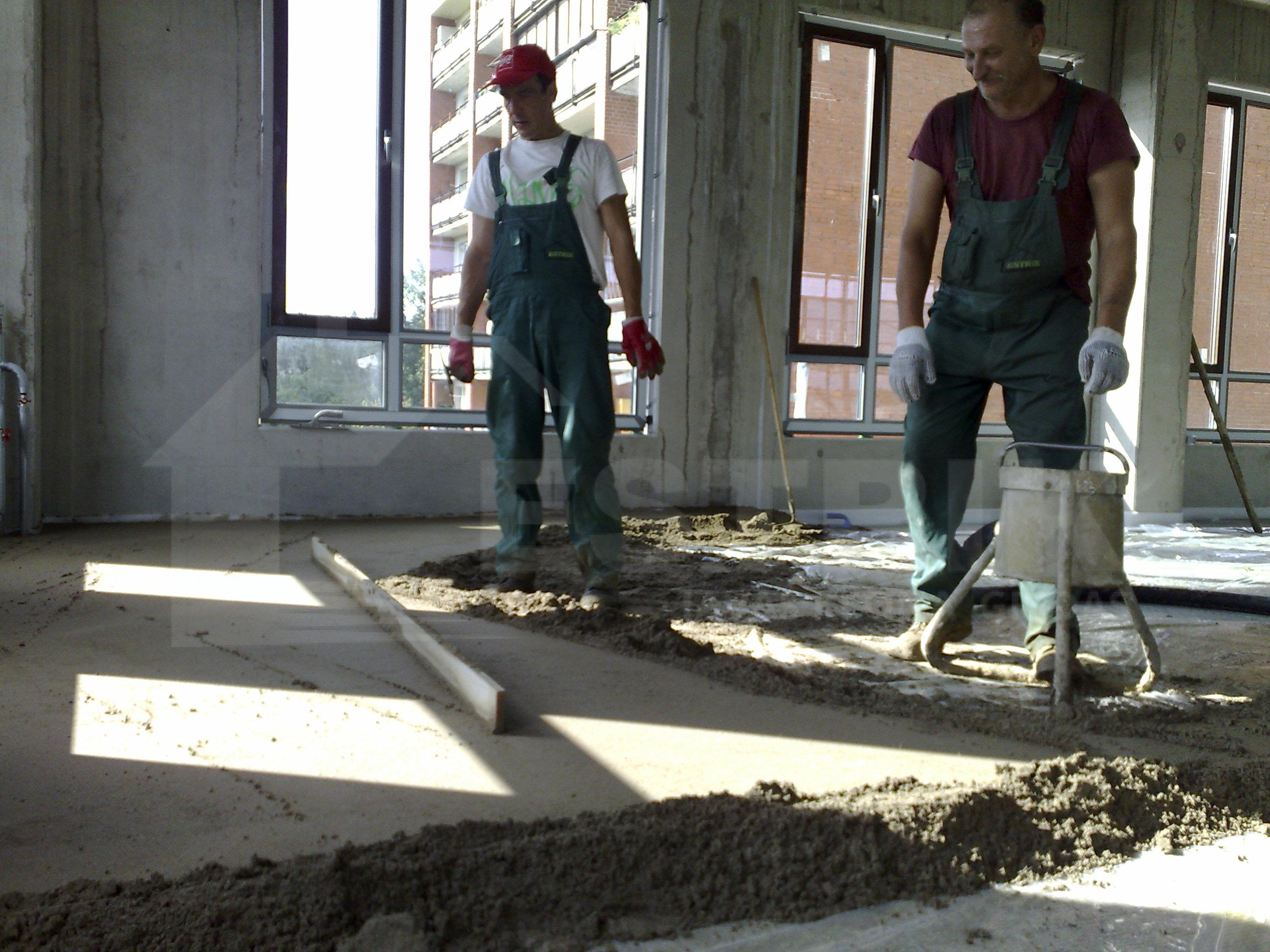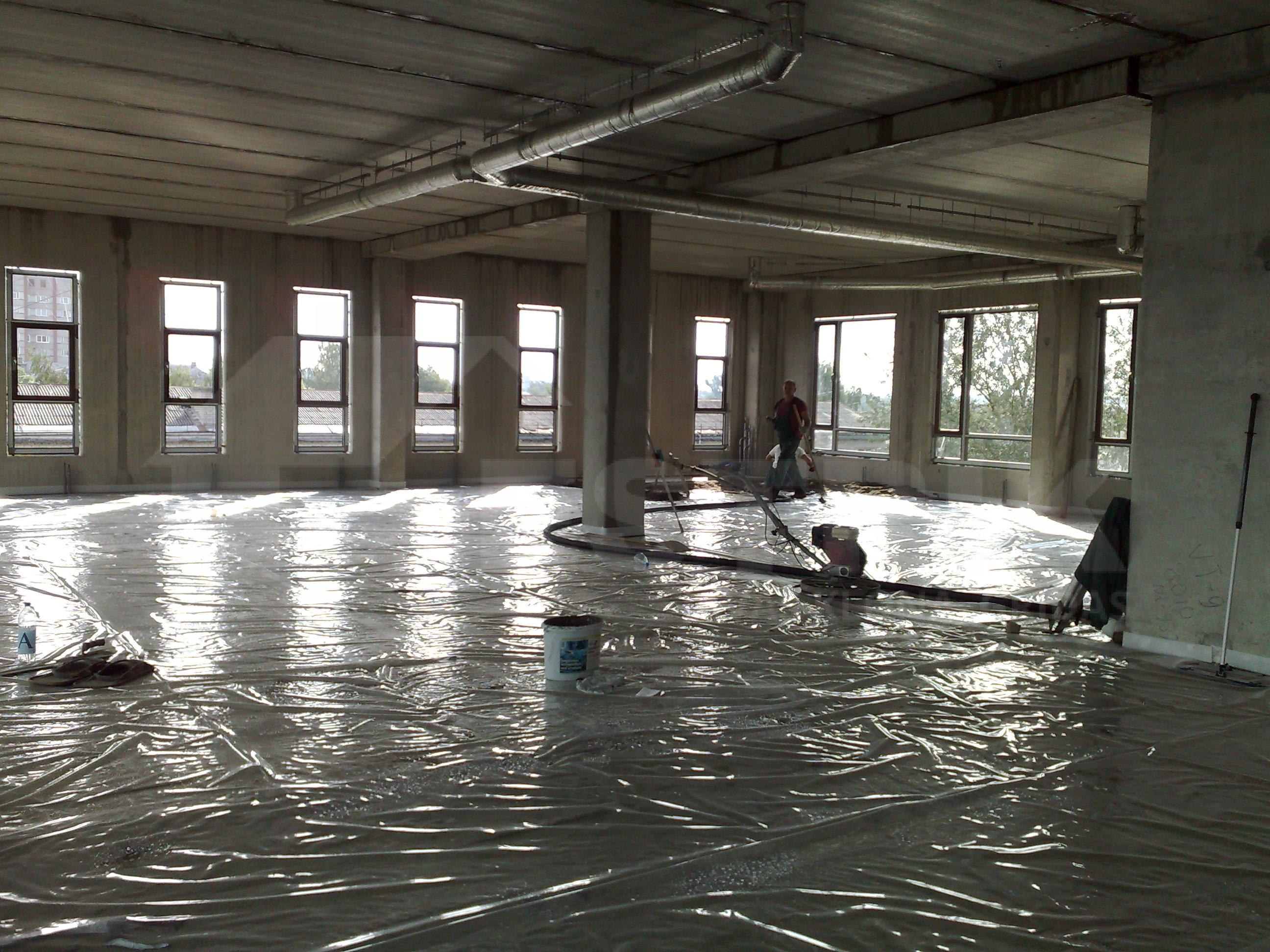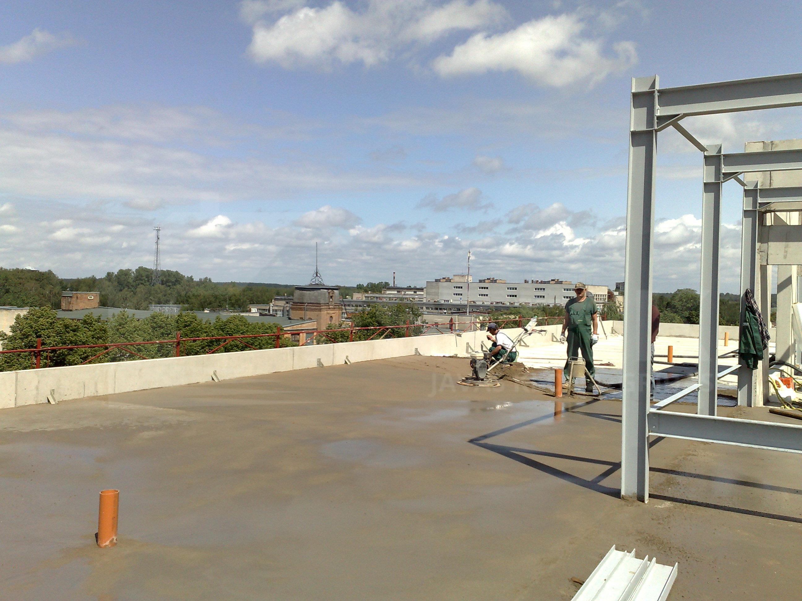 Skaņas izolācijas materiāla (grīdas akmens vate), tvaika izolācijas materiāla PE plēves ieklāšana, grīdu betonēšana – armēta javas klona (estrich) grīda ofisa telpām.